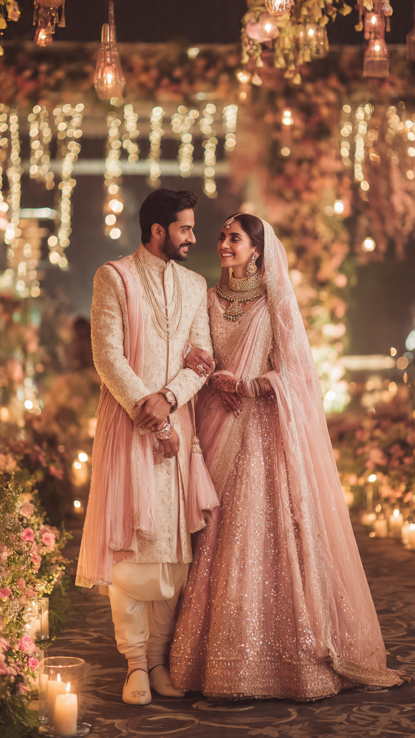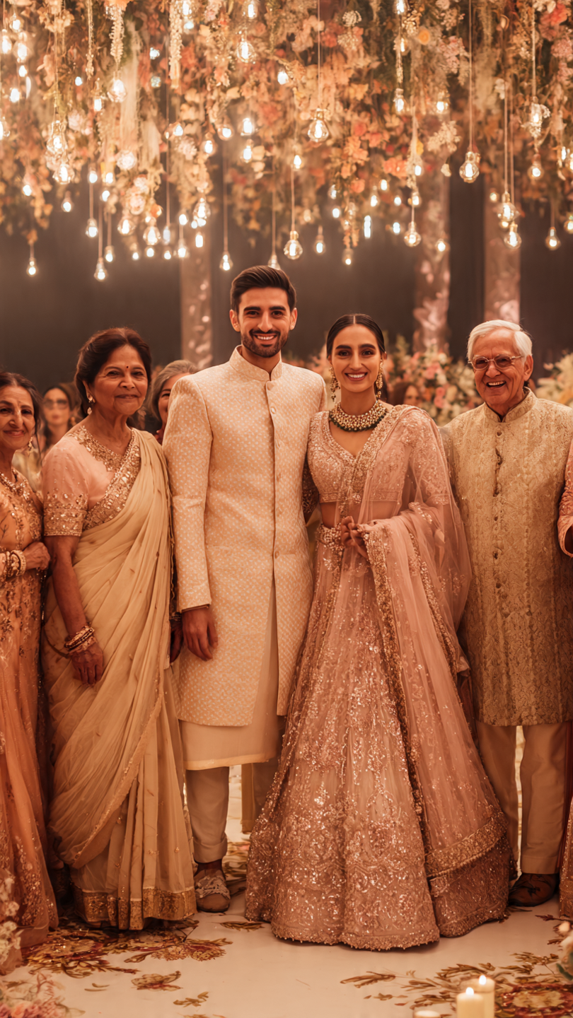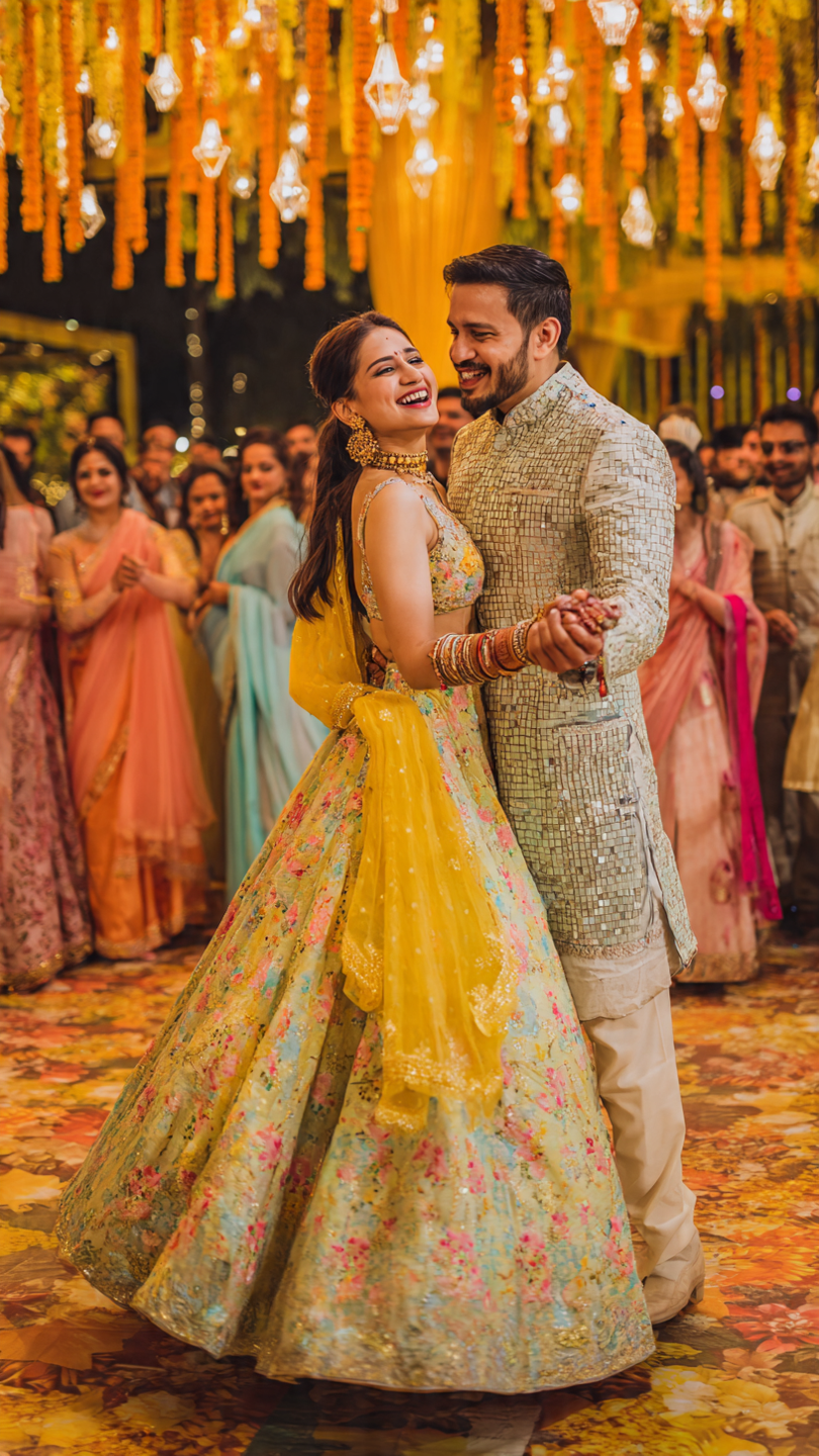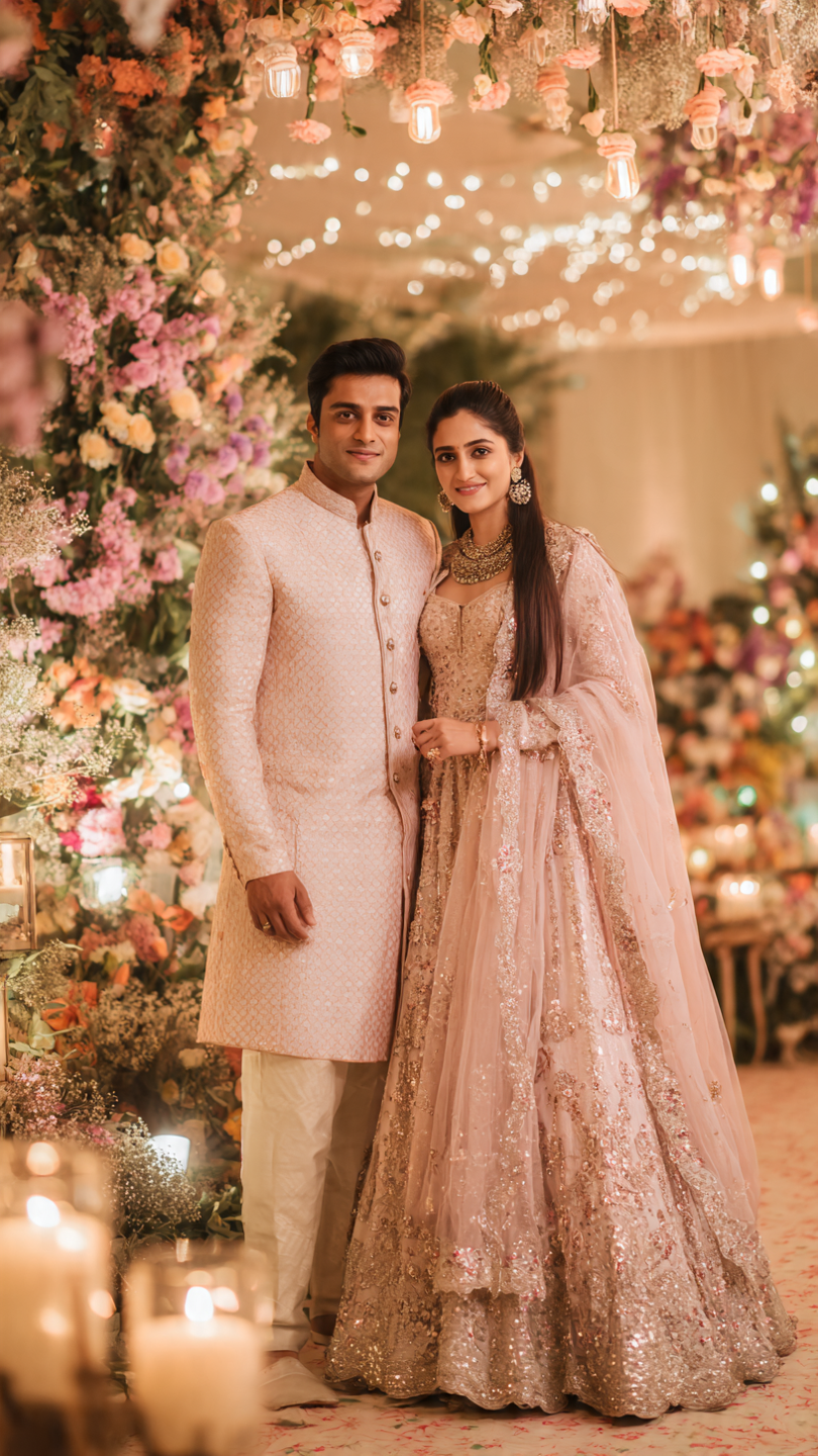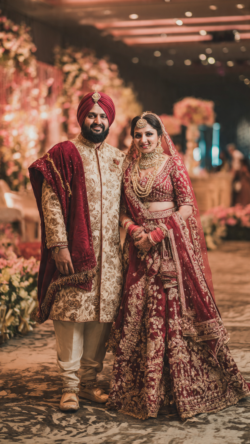 Our Reception & Sangeet Lehengas are crafted for sparkle and movement – shimmer fabrics, light can-can, and silhouettes that flow on the dance floor.